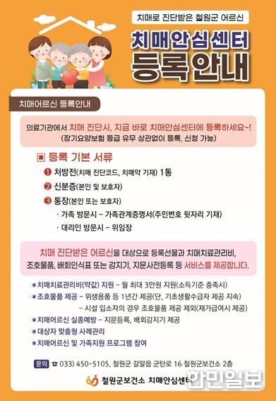 철원군보건소 질병관리과 박정순 과장은 “치매로부터 걱정 없는 행복한 철원군을 만들기 위해서는 무엇보다 치매환자 등록이 중요하다”며 “치매안심센터 등록을 통해 환자와 가족이 안심하고 생활할 수 있도록 지속적으로 지원하겠다”고 말했다.