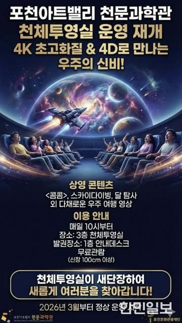 한민일보 서울포커스 심기옥 기자 | 포천문화관광재단이 운영하는 포천아트밸리 천문과학관이 약 1년간의 준비와 개선 사업을 마치고, 3월 4일부터 새롭게 단장한 천체투영실 운영을 재개한다.