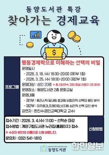한민일보 서울포커스 김성혜 기자 | (재)인천광역시계양구인재양성장학교육재단 동양도서관은 성인을 대상으로 ‘찾아가는 경제교육 특강’을 운영한다고 밝혔다.
