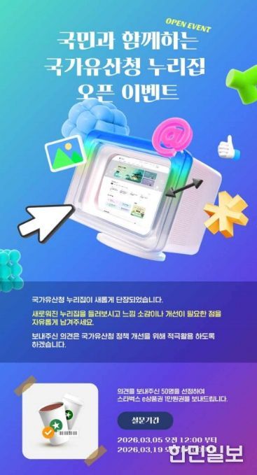 국가유산청은 3월 5일부터 19일까지 이번 누리집 개편 소식을 국민에게 알리고 이용을 활성화하기 위해 ‘소문내고 축하해’ 온라인 이벤트를 개최한다. 개편된 국가유산청 누리집 이용 소감을 남긴 국민 중 50명(우수 의견 10명, 추첨 40명)에게 모바일 선물 교환권을 증정한다. 당첨자는 3월 말 중으로 국가유산청 누리집 발표와 개별 알림을 통해 공지할 예정이다.