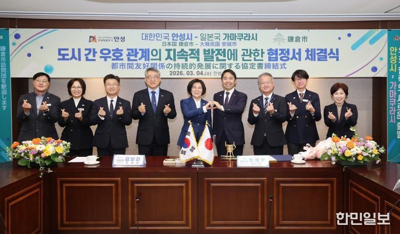 한민일보 서울포커스 임경복 기자 | 안성시는 2026년 3월 4일 오전 11시 안성시청 본관 2층 상황실에서 일본 가나가와현 가마쿠라시(시장 마쓰오 다카시)와 '도시 간 우호 관계의 지속적 발전에 대한 협정'을 체결하고 양 도시 간 문화·예술 및 청소년 분야 교류를 본격 추진하기로 했다.