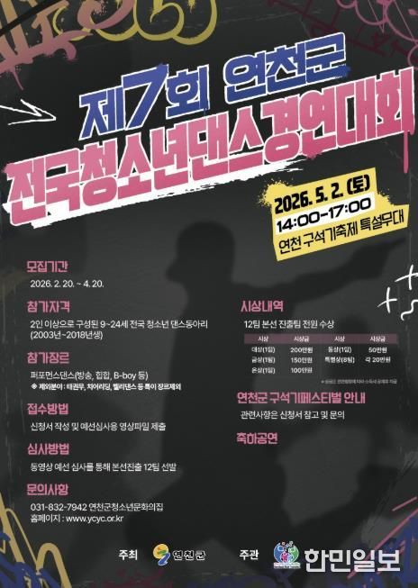 한민일보 서울포커스 임경복 기자 | (재)연천군청소년육성재단(청소년문화의집)은 전국 청소년들이 꿈과 열정을 마음껏 펼칠 수 있는 무대를 마련하고, 창의적인 문화예술 활동을 확산하기 위해 제7회 연천군 전국청소년댄스경연대회를 개최한다고 밝혔다.