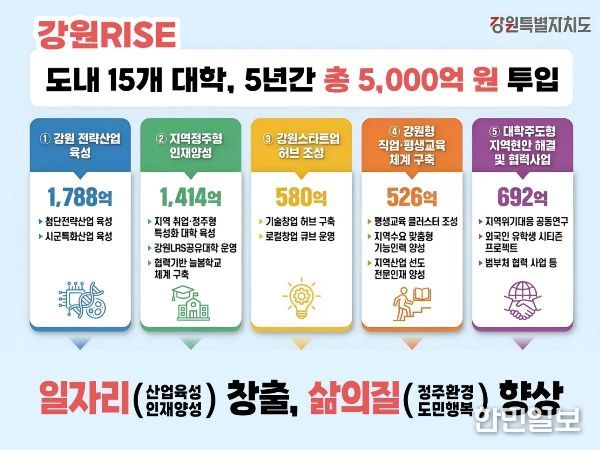 - 도는 ▲강원 전략산업 육성 1,788억 원 ▲지역 정주형 인재양성 1,414억 원 ▲강원 스타트업 허브 조성 580억 원 ▲강원형 직업‧평생교육 체계 구축 526억 원 ▲대학주도형 지역현안해결 및 협력사업 692억 원 등 5대 프로젝트를 중심으로 강원형 지역혁신 모델 구축을 추진하고 있다.