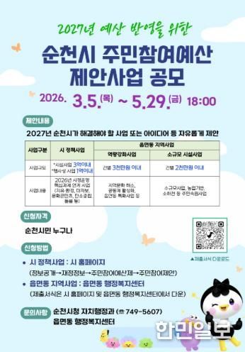 한민일보 서울포커스 임광현 기자 | 순천시는 2027년도 예산편성 과정에 시민의 다양한 의견과 아이디어를 반영하기 위해 3월부터 5월까지 주민참여예산 제안사업을 접수한다고 밝혔다.