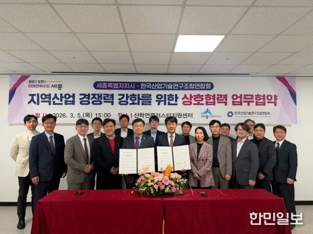 한민일보 서울포커스 임철현 기자 | 세종특별자치시가 5일 산학연클러스터지원센터에서 ㈔한국산업기술연구조합연합회(회장 김진우)와 지역산업 경쟁력 강화와 상호 협력을 위한 업무협약을 체결했다.