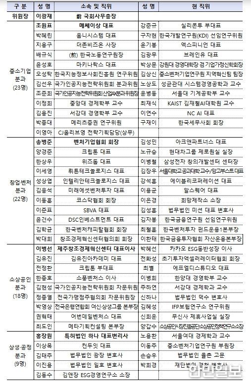 민관 정책협의회는 기업인, 민간 전문가, 학계, VC, 협·단체 등 총 72명의 위원으로 구성되어 출범일로부터 1년간 활동하게 된다. 또한 한성숙 중기부 장관과 이광재 전 국회사무총장이 공동위원장을 맡아 민관 정책협의회를 이끌어갈 예정이다.