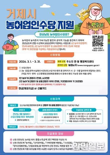 한민일보 서울포커스 김은금 기자 | 거제시는 농어업·농어촌의 공익적 기능을 유지·증진하고 농어업인의 소득 안정을 지원하기 위해 ‘2026년 농어업인수당’ 신청을 3월 1일부터 3월 31일까지 접수하고 있다.