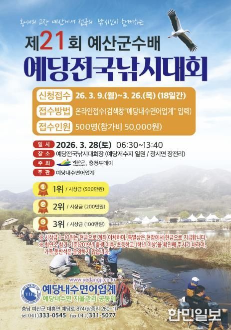 한민일보 서울포커스 임경복 기자 | 예산군은 오는 3월 28일 예당전국낚시대회장에서 ‘제21회 예산군수배 예당전국낚시대회’를 개최한다고 밝혔다.