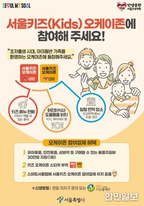 서울키즈 오케이존으로 지정되기 위해서는 ▲아이가 먹을 수 있는 ‘키즈 메뉴’ 구비 ▲유아용 식기·의자 등 어린이 식사 도움 용품 비치 ▲권장 영업면적 80㎡ 이상 등의 일정 요건을 갖춰야 한다. 지정 조건을 갖추고 있으며 사업에 참여하기 원하는 업주라면 누구나 ‘탄생육아 몽땅정보통’ 누리집을 통해 신청할 수 있다.