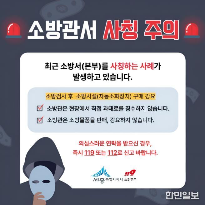 한민일보 서울포커스 김윤이 기자 | 최근 세종소방본부를 사칭해 소방용품 구매를 강요하는 사기 시도가 잇따르고 있어 시민들의 각별한 주의가 요구된다.