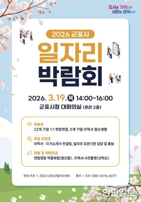 한민일보 서울포커스 임경복 기자 | 군포시는 오는 3월 19일 오후 2시부터 시청 대회의실에서 ‘2026년 군포시 일자리 박람회’를 개최한다. 이번 박람회는 지역 내 우수 기업과 구직자가 직접 만나는 채용의 장으로 제조, 서비스, 물류배송, 의료복지 등 다양한 분야에서 폭넓은 취업 기회를 제공할 예정이다.