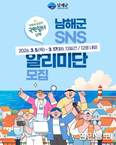 한민일보 서울포커스 김서윤 기자 | 남해군이 ‘2026년 자연과 감성의 국민쉼터’ 남해의 다채로운 매력을 널리 전파할 ‘제9기 남해군 SNS 알리미단’을 오는 3월 5일부터 17일까지 13일간 모집한다.