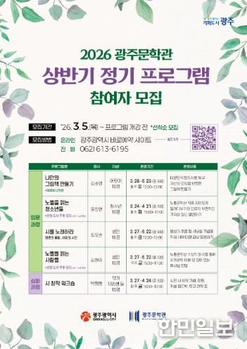 한민일보 서울포커스 임경복 기자 | 광주광역시는 시민의 문학적 감수성과 창작 역량을 키우기 위해 ‘2026년 광주문학관 상반기 정기 프로그램’을 운영한다.