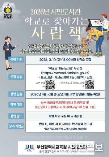 한민일보 서울포커스 임광현 기자 | 부산광역시립시민도서관(관장 이은경)은 오는 4월부터 6월까지 부산 남부·동래교육지원청 관내 초·중학교 및 부산 관내 고등학교 등 16개교를 대상으로 ‘2026년 학교로 찾아가는 사람책’ 프로그램을 운영한다.