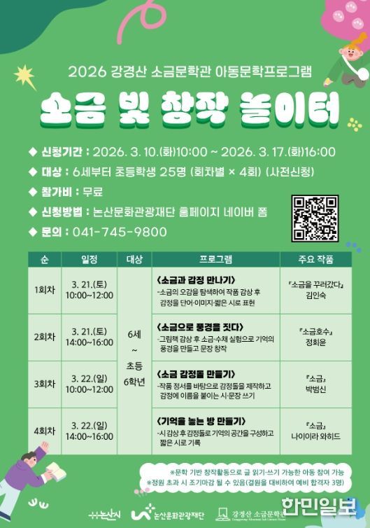 한민일보 서울포커스 유돈상 기자 | 논산문화관광재단은 지역 어린이들의 상상력과 문학적 감수성을 키우는 아동문학 프로그램 “소금 빛 창작 놀이터”를 강경산소금문학관에서 3월 21일부터 22일까지 총 4회차로 운영한다.