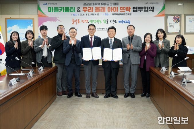 한민일보 서울포커스 임경복 기자 | 제주특별자치도교육청은 제주특별자치도개발공사와 5일 도교육청 상황실에서 공공임대주택 유휴공간을 활용한 ‘우리 올레 아이 뜨락’ 사업과 도교육청 ‘2026 마을키움터 운영’ 사업의 상호 협력을 위한 업무협약을 체결했다.