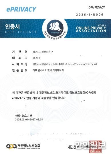 한민일보 서울포커스 임경복 기자 | 김천시시설관리공단(이사장 김재광)은 개인정보 보호 수준 향상과 안전한 정보관리 체계 구축을 위해 개인정보보호협회(OPA)가 주관하는 ‘ePRIVACY 인증’을 획득했다고 밝혔다.