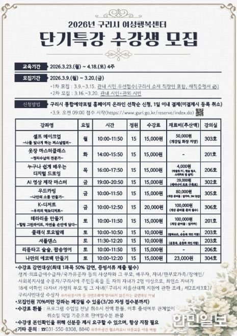 한민일보 서울포커스 임경복 기자 | 구리시 여성행복센터는 오는 3월 23일부터 4주간 2026년 단기 특강 교육프로그램을 운영한다.