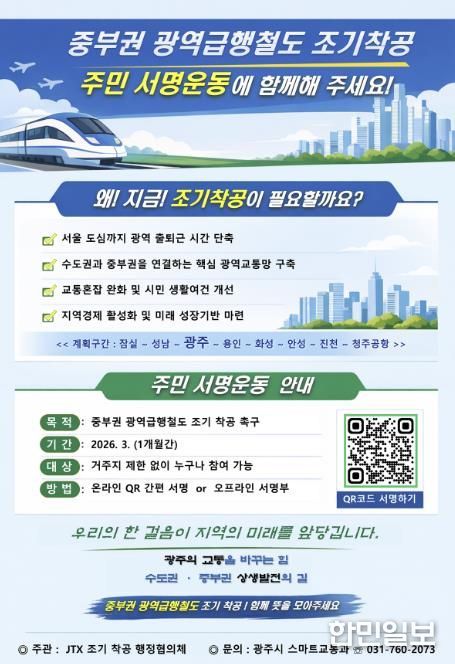한민일보 서울포커스 곽중희 기자 | 광주시는 중부권 광역급행철도의 조기 착공을 촉구하기 위해 3월 한 달간 주민 서명운동을 한다고 6일 밝혔다.