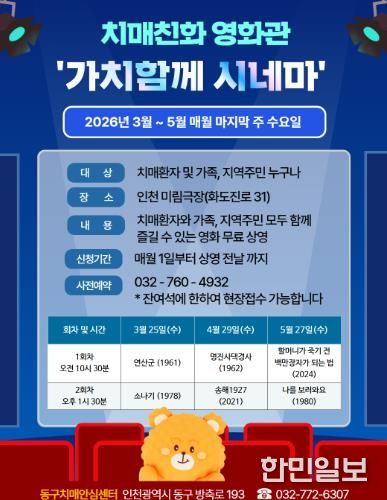 한민일보 서울포커스 백진욱 기자 | 인천 동구는 치매환자와 가족, 지역주민이 문화를 향유 할 수 있는 치매친화 영화관 ‘가치함께 시네마’를 오는 3월~5월까지 매월 마지막 주 수요일 운영한다고 밝혔다.