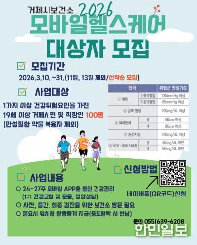 한민일보 서울포커스 김은금 기자 | 거제시보건소는 오는 3월 10일부터 모바일 헬스케어사업에 참여할 시민 100명(선착순)을 모집한다.