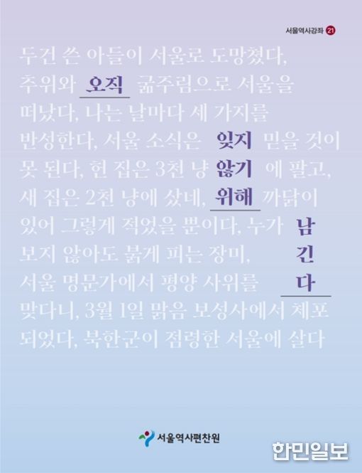 한민일보 서울포커스 국용호 기자 | 서울역사편찬원이 서울에서 살았던 개인이 남긴 기록을 통해 서울의 역사를 살펴보는 ‘서울역사강좌 제21권 《오직 잊지 않기 위해 남긴다》’를 발간했다. 시민들에게 서울의 역사를 쉽고 흥미롭게 알리는 ‘서울역사강좌’의 2026년 상반기 수업 내용을 책으로 엮은 것으로, 해당 강좌의 교재로도 활용된다.