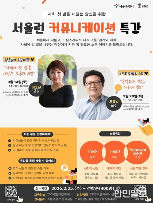 한민일보 서울포커스 국용호 기자 | 서울시가 새로운 환경에 첫발을 내딛는 대학생과 사회 초년생들이 사회 적응 과정에서 겪는 소통의 어려움을 완화하고, 건강한 커뮤니케이션 역량을 높이기 위해 소통 전문가 이호선·김경일 교수와 함께 ‘서울런 커뮤니케이션 특강’을 개최한다.