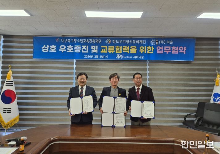 한민일보 서울포커스 임경복 기자 | 청도우리정신문화재단(대표이사 기화서)은 지난 3월 4일 화랑정신을 이어가는 청도신화랑풍류마을에서 (재)대구북구청소년교육진흥재단(상임이사 이복우), 한국코미디타운 운영주체 ㈜리온(대표 김미숙)과 상호 우호 증진 및 교류 협력을 위한 업무협약(MOU)을 체결했다.