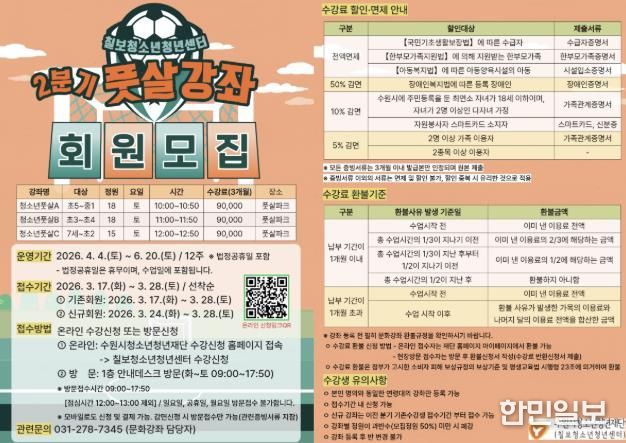 한민일보 서울포커스 진광성 기자 | 수원시청소년청년재단 칠보청소년청년센터는 지역 청소년들의 건강한 여가 생활과 체력 증진을 위해녪년 2분기 문화강좌(풋살 교실)’수강생을 모집한다고 밝혔다.