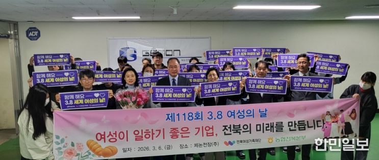 한민일보 서울포커스 박용남 기자 | 전북특별자치도는 6일 제118회 세계 여성의 날을 맞아 전북여성가족재단, 농협중앙회 전북본부와 함께 여성친화기업 제논전장㈜를 방문해 여성 근로자들을 격려하고 성평등 조직문화 확산을 위한 기념행사를 개최했다.