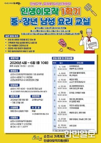 한민일보 서울포커스 임광현 기자 | 순천시는 중·장년 남성의 건강한 식생활 형성과 활기찬 인생 2막 준비를 지원하기 위해 ‘중·장년 남성 요리교실’ 수강생을 모집한다고 밝혔다.