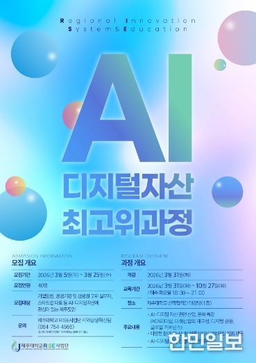 한민일보 서울포커스 임경복 기자 | 지역과 대학의 동반성장을 목표로 제주 RISE사업에 참여하고 있는 제주대학교 RISE사업단(단장 강철웅)은 제주 AI·디지털 대전환 로드맵과 연계하여 지역 산업의 변화를 선도할 핵심 리더 양성을 위해'AI·디지털자산 최고위과정 2기'를 운영하며, 오는 3월 25일까지 수강생을 모집하고 있다.