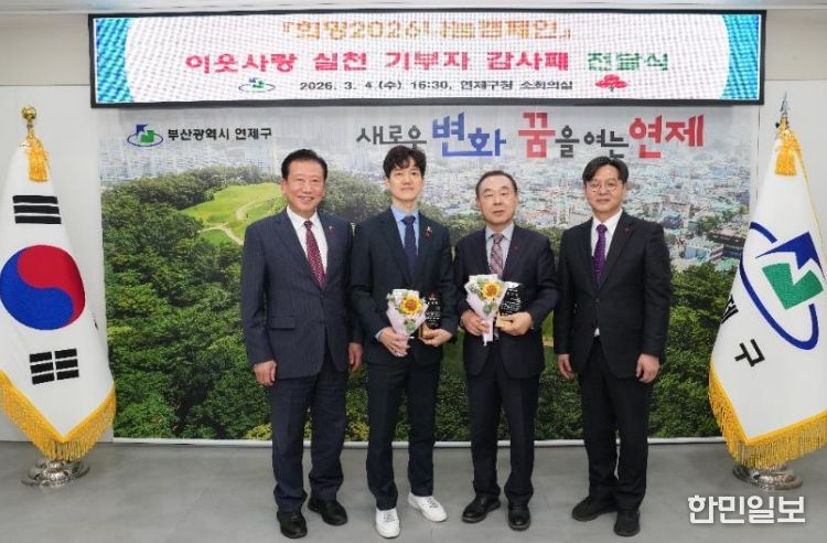한민일보 서울포커스 임광현 기자 | 연제구는 지난 3월 4일, 부산사회복지공동모금회(회장 이수태)와 함께 '희망2026나눔캠페인 이웃사랑 실천 기부자'에게 감사패를 전달했다.