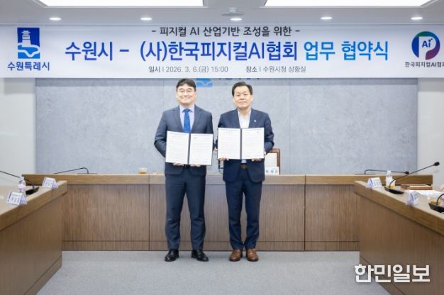 한민일보 서울포커스 진광성 기자 | 수원특례시와 (사)한국피지컬에이아이(AI)협회는 6일 시청 상황실에서 업무협약을 체결하고, 피지컬 인공지능(AI) 산업 활성화를 위해 적극적으로 협력하기로 했다.