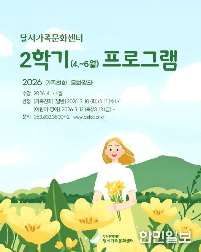 한민일보 서울포커스 임경복 기자 | 대구 달서구 달서가족문화센터는 2026년 2학기(4~6월) 문화강좌 수강생을 오는 3월 10일부터 모집한다.