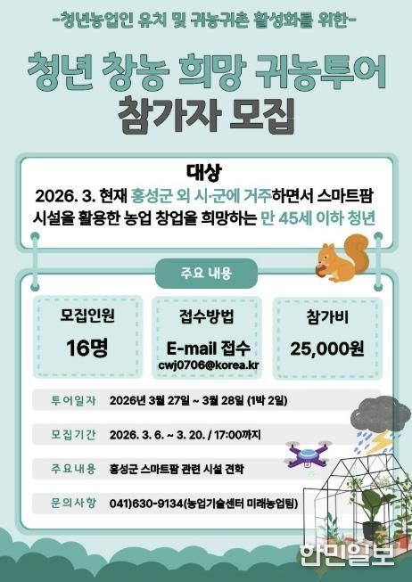 군 관계자는 “이번 프로그램은 미래 농업의 핵심인 청년들에게 홍성군의 스마트팜을 알리고, 안정적인 정착을 돕기 위해 마련했다”며, “홍성군에 우수한 농업 인재들이 모여 꿈을 펼칠 수 있도록 환경 조성에 노력하겠다”고 말했다.