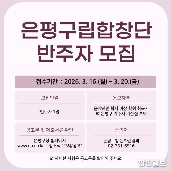 한민일보 서울포커스 임광현 기자 | 서울 은평구는 오는 16일부터 20일까지 은평구립합창단 피아노 반주자 1명을 공개 모집한다고 밝혔다.