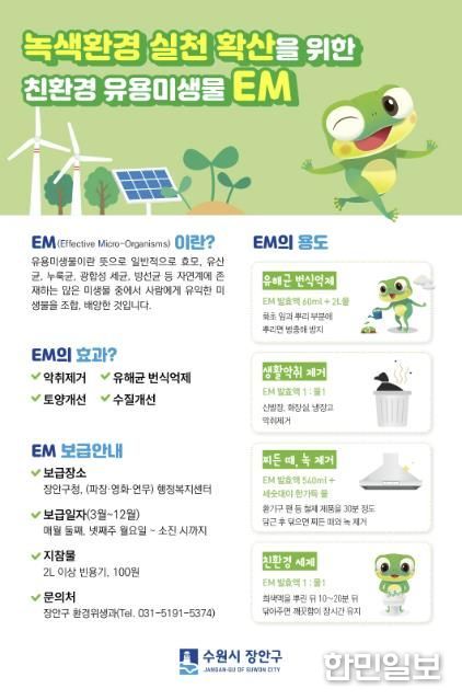 수원시 장안구 관계자는 “2026년에도 시민들의 많은 관심과 참여를 부탁드린다”며 “EM 보급을 통해 시민들이 일상 속에서 친환경 생활을 실천하는 데 도움이 되길 기대한다”고 말했다.