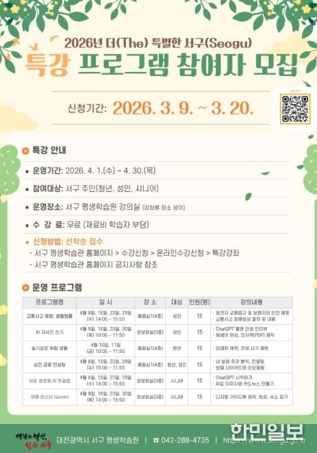 한민일보 서울포커스 임경복 기자 | 대전 서구 평생학습원은 ‘2026년 봄학기 더(The) 특별한 서구(seogu)’특강 참여자를 모집한다고 9일 밝혔다.