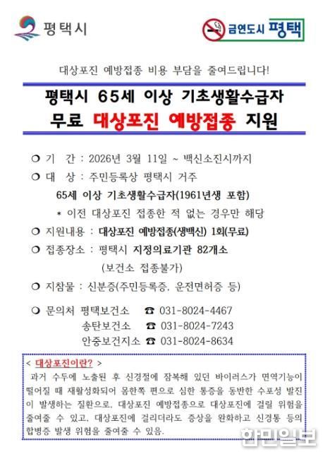 한민일보 서울포커스 황준형 기자 | 평택시는 65세 이상 취약계층 어르신의 건강증진과 예방접종 비용 부담 완화를 위해 ‘대상포진 예방접종을 연중 무료로 지원’한다고 밝혔다.