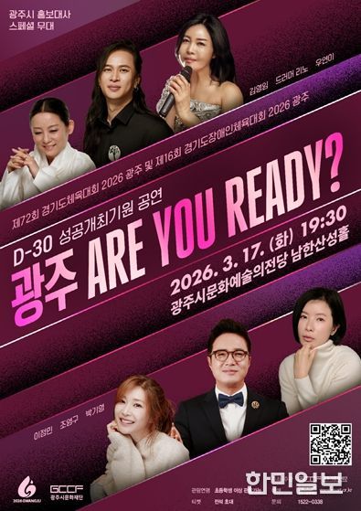 한민일보 서울포커스 임경복 기자 | 광주시문화재단은 오는 3월 17일 오후 7시 30분, 광주시문화예술의전당 남한산성홀에서 ‘제72회 경기도체육대회 2026 광주 및 제16회 경기도장애인체육대회 2026 광주 D-30 성공기원 공연’ '광주! ARE YOU READY?'’를 개최한다.