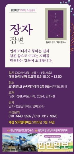 한민일보 서울포커스 박정민 기자 | 전남대학교 중국인문연구소가 시민과 함께 동양 고전을 읽으며 인문학적 지혜를 나누는 ‘행인학당 2026년 노장강좌’를 개최한다.