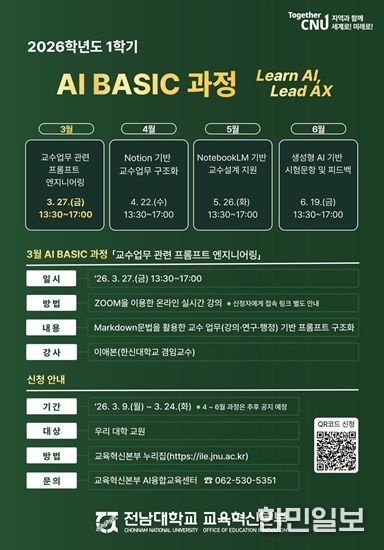 10일 전남대에 따르면, 전남대학교 교육혁신본부(본부장 정은경)는 2026학년도 1학기 전 교원을 대상으로 ‘AI BASIC 과정’을 운영한다.