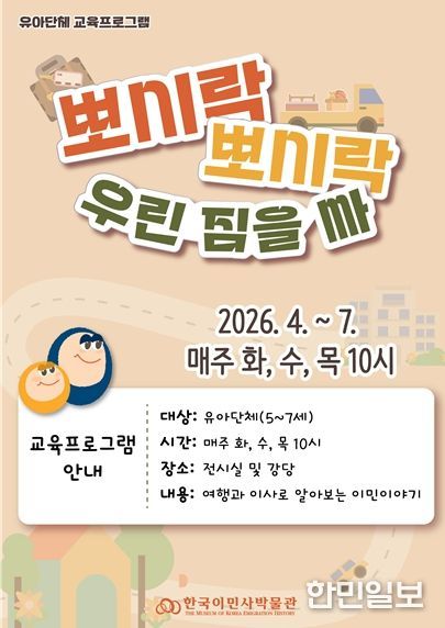 한민일보 서울포커스 유창렬 기자 | 인천광역시 한국이민사박물관은 유아 단체교육 '뽀시락 뽀시락 우린 짐을 싸'를 운영한다고 밝혔다.