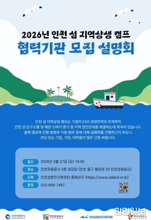 한민일보 서울포커스 유창렬 기자 | 인천광역시와 인천관광공사는 기업·기관·대학의 ESG 실천과 인천 섬 지역 상생을 연계하기 위한'2026 인천 섬 지역상생 캠프'협력기관 모집 설명회를 3월 27일 오후 2시 상상플랫폼 3층에서 개최한다고 밝혔다.