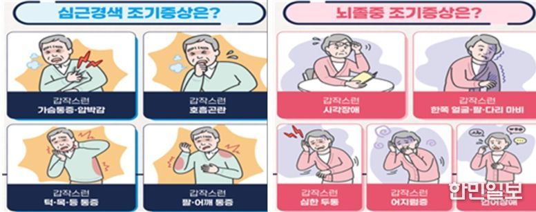 시는 심근경색 및 뇌졸중의 조기증상을 숙지하고, 의심 증상이 발생할 경우 지체 없이 119에 신고해 신속하게 전문 치료를 받을 것을 당부했다.