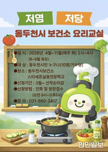 한민일보 서울포커스 임경복 기자 | 동두천시보건소는 2026년 만성질환 관리 및 예방을 위한 ‘저염·저당 식단 요리 프로그램’ 참여자 60명(매월 10명씩)을 선착순 모집한다고 밝혔다.
