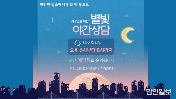 한민일보 서울포커스 심기옥 기자 | 포천시정신건강복지센터는 직장인, 학생, 취업 준비생 등 낮 시간 상담 이용이 어려운 시민들이 보다 편리하게 마음건강 상담을 받을 수 있도록 ‘야간 마음건강 상담서비스(별빛 야간 상담)’를 운영한다.