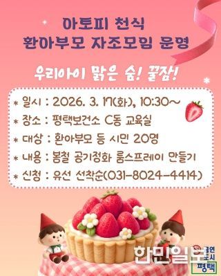 한민일보 서울포커스 황준형 기자 | 평택시는 알레르기 질환으로부터 안전한 지역사회 환경을 조성하기 위해 오는 17일 오전 10시 30분, 평택보건소(C동) 교육실에서 ‘아토피·천식 환아 부모 자조모임’을 운영한다고 밝혔다.