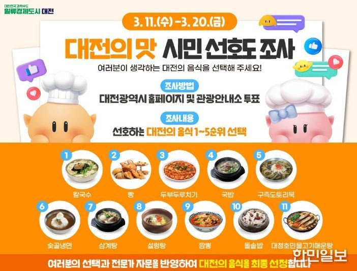 조사는 대전시민 누구나 참여 가능하며, 대전 음식 후보군 11개를 대상으로 선호하는 음식을 순위별로 선택하는 방식이다.